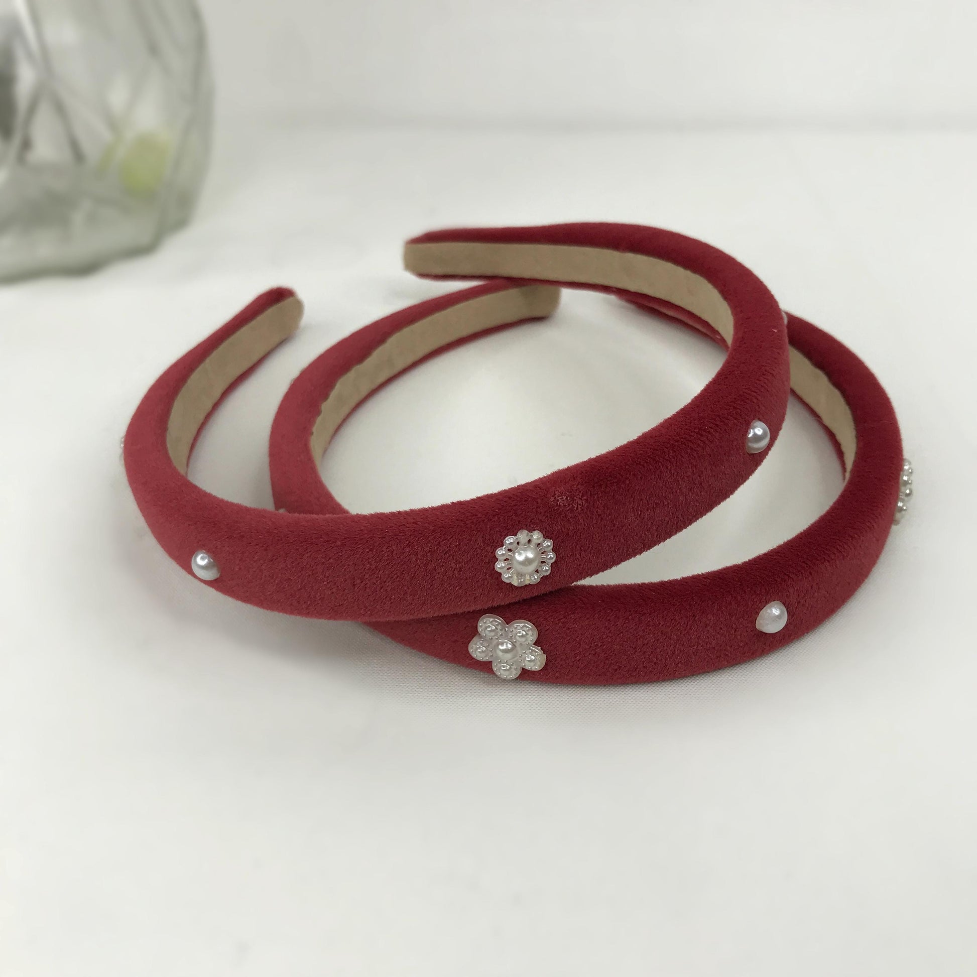 Handmade Red Velvet Faux Cream Pearl Floral Flower Statement Headband