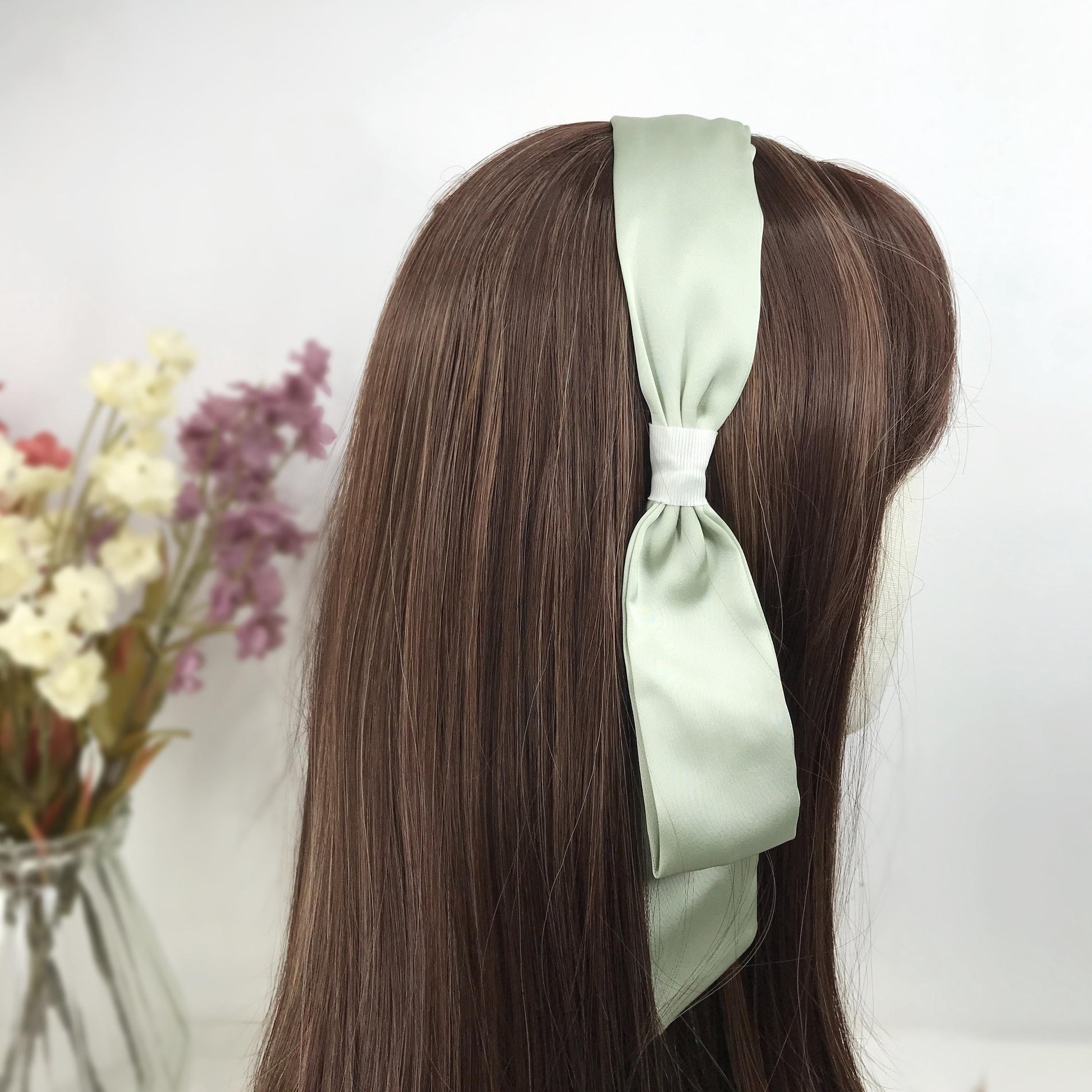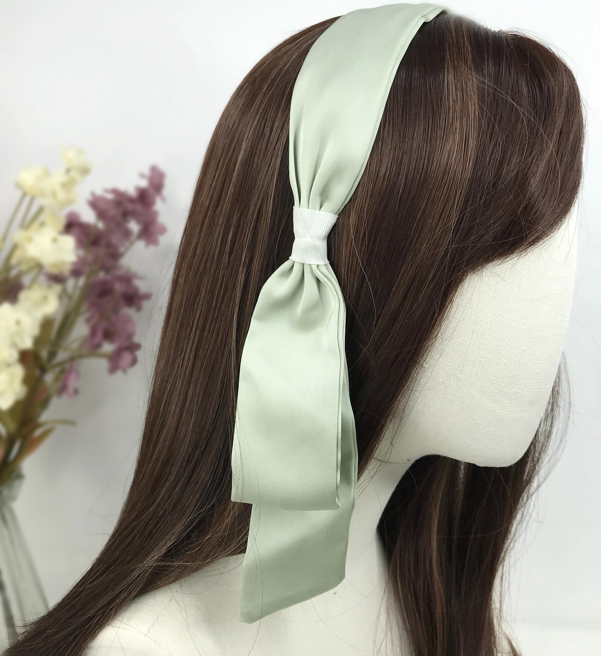 Handmade Sage Green Satin Side Flowing Ribbon Statement Feminine Headband Vintage 60s Audrey Hepburn Inspired