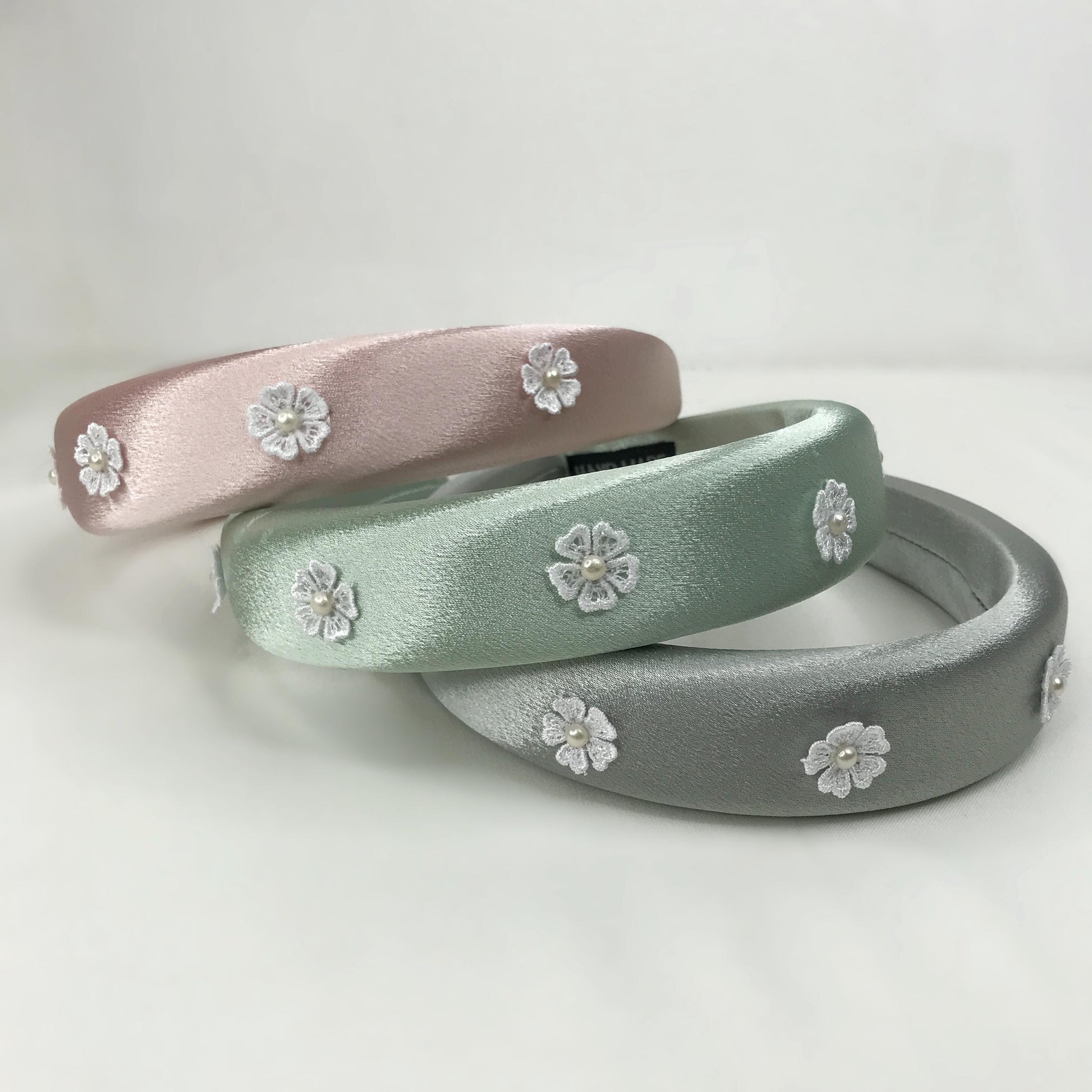 A beautiful handmade satin headband embellished with vintage lace flowers topped with a faux pearl centre.